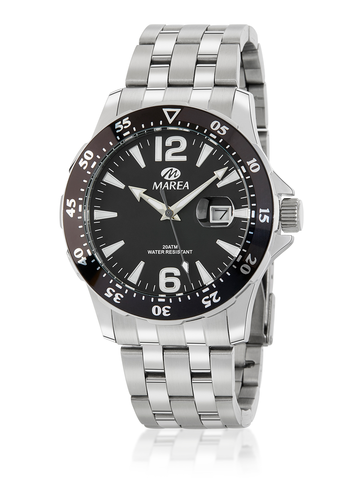 Movimiento japonés: 3 agujas con calendario Diámetro Caja: 42 mm. Material Caja: Acero Material Brazalete: Acero Esfera: Color negro Resistente al agua: 20 ATM
