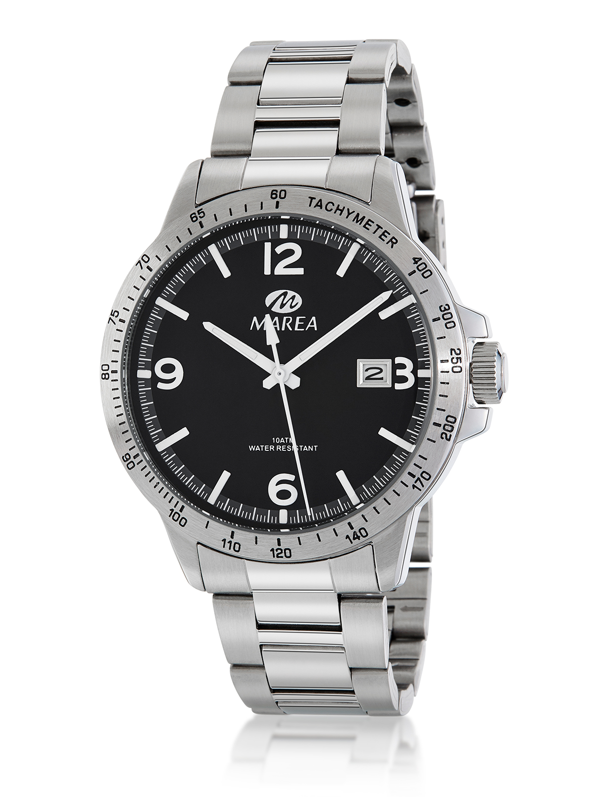 Movimiento japonés: 3 agujas con calendario Diámetro Caja: 42 mm. Material Caja: Acero Material Brazalete: Acero Esfera: Color negro Resistente al agua: 10 ATM