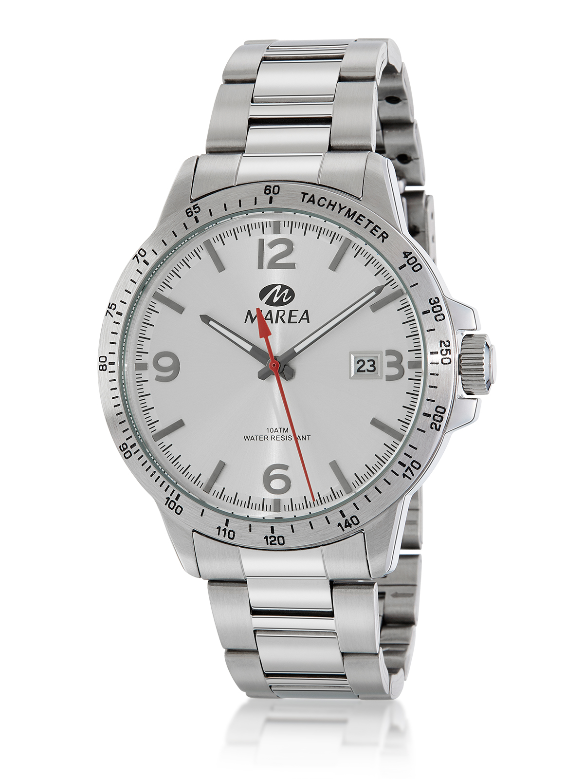 Movimiento japonés: 3 agujas con calendario Diámetro Caja: 42 mm. Material Caja: Acero Material Brazalete: Acero Esfera: Color gris, segundero en rojo Resistente al agua: 10 ATM