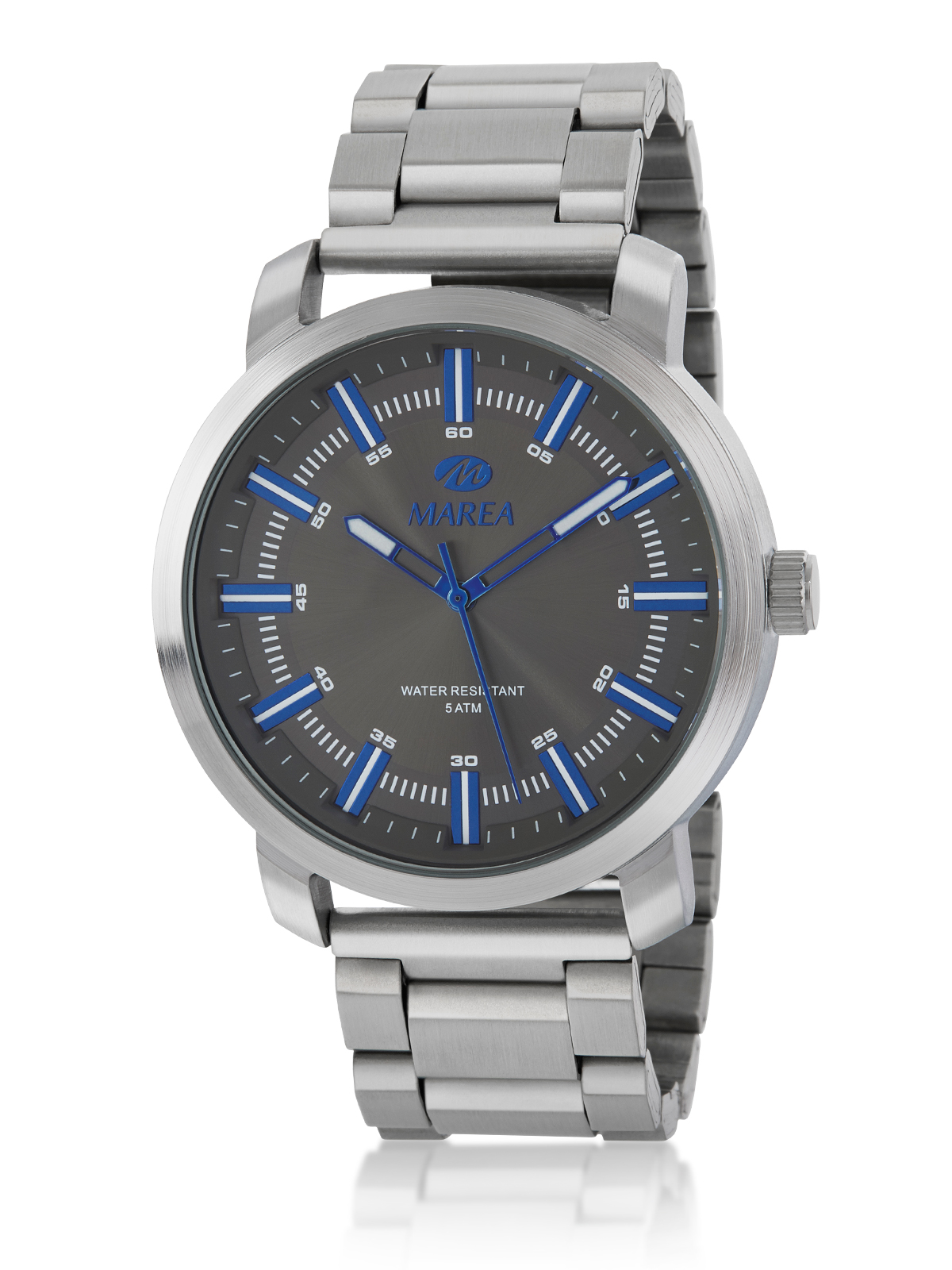 Movimiento japonés: 3 agujas Diámetro Caja: 44 mm. Material Caja: Metal Material Brazalete: Acero Esfera: Color gris con detalles en azul Resistente al agua: 5 ATM