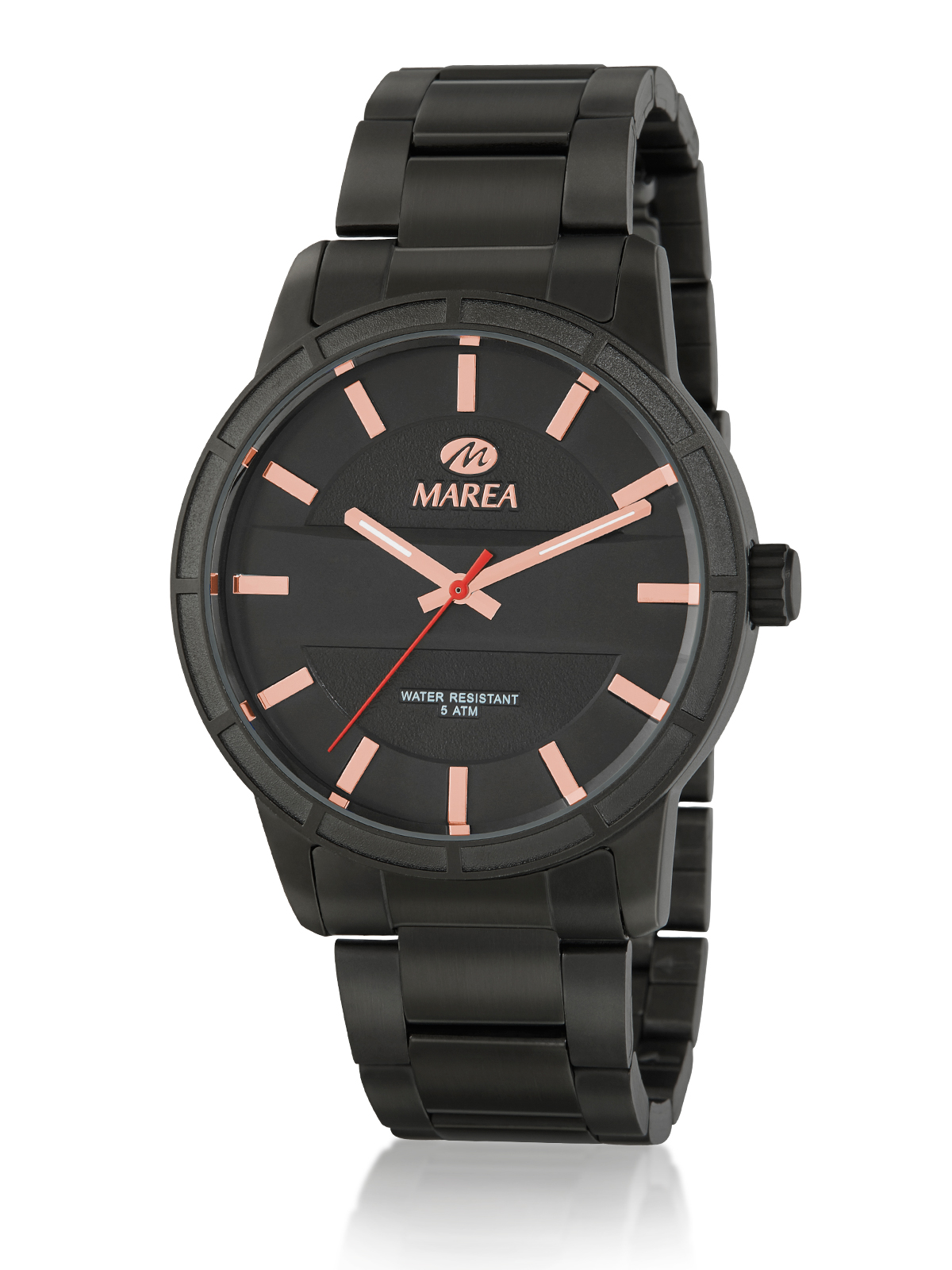 Movimiento japonés: 3 agujas Diámetro Caja: 42 mm. Material Caja: Metal Material Brazalete: Acero en color negro Esfera: Color negro agujas en rose gold Resistente al agua: 5 ATM
