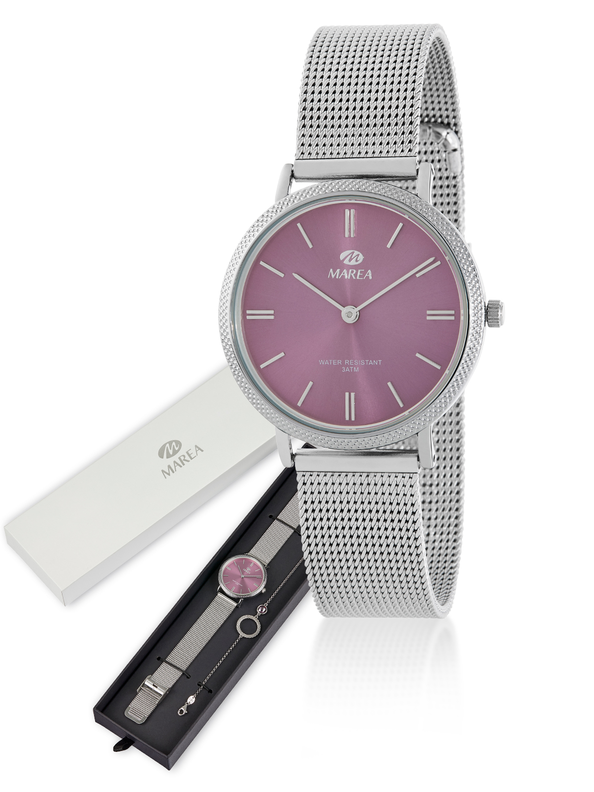 Movimiento japonés: 2 agujas Diámetro Caja: 34 mm. Material Caja: Metal Material Brazalete: Acero, malla milanesa Esfera: Efecto rayo de luz en color morado Resistente al agua: 3 ATM Incluye una pulsera de plata de ley de regalo
