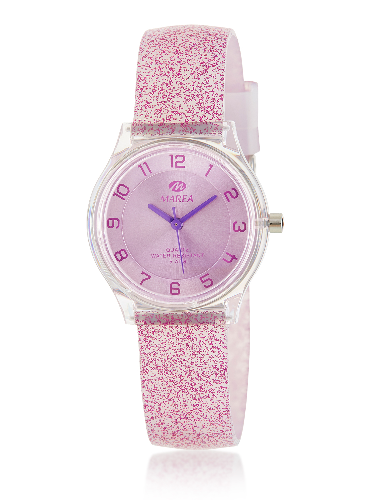 Movimiento japonés: 3 agujas Diámetro Caja: 32 mm. Material Caja: Plástico Material Brazalete: Silicona color rosa Resistente al agua: 5 ATM
