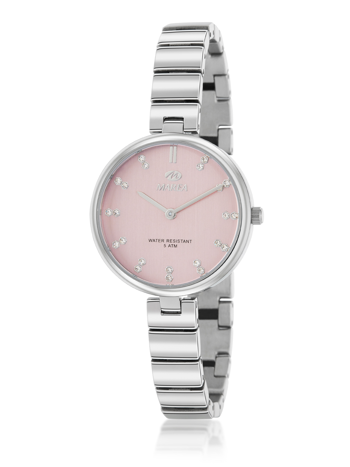 Movimiento japonés: 2 agujas Diámetro Caja: 32 mm. Material Caja: Acero Material Brazalete: Acero Esfera: Color rosa, detalles en gris Resistente al agua: 5 ATM