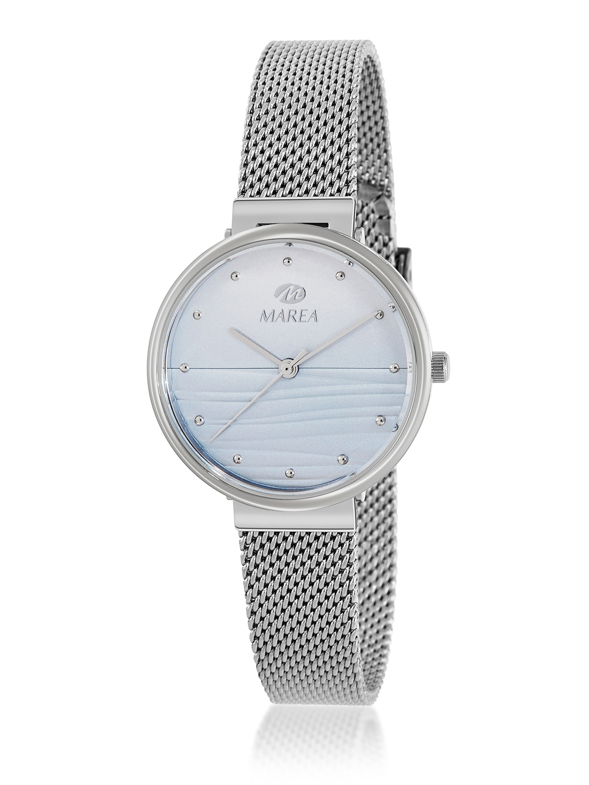Movimiento japonés: 3 agujas Diámetro Caja: 32 mm. Material Caja: Acero Material Brazalete: Acero malla milanesa Esfera: Color blanco con degradado azul Resistente al agua: 5 ATM