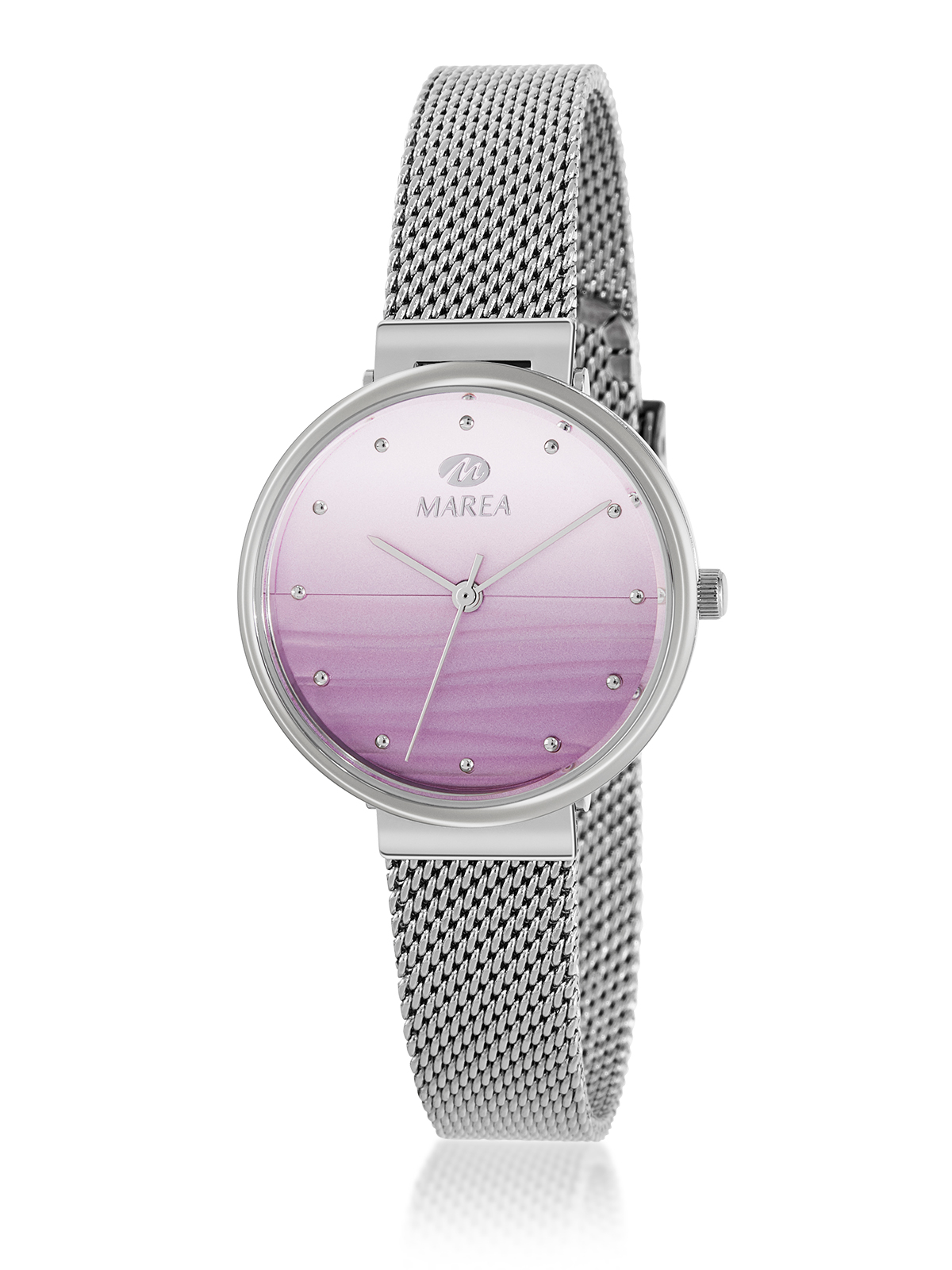 Movimiento japonés: 3 agujas Diámetro Caja: 32 mm. Material Caja: Acero Material Brazalete: Acero malla milanesa Esfera: Color blanco con degradado lila Resistente al agua: 5 ATM