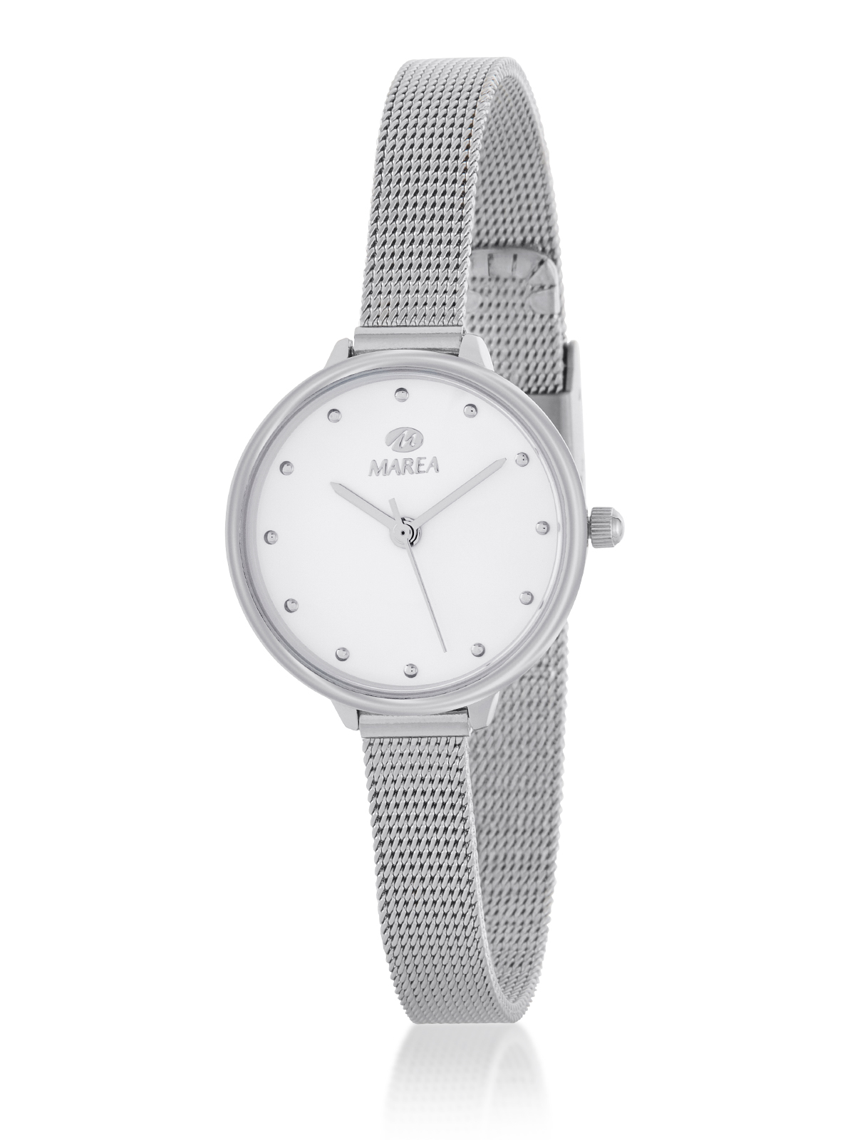 Movimiento japonés: 3 agujas Diámetro Caja: 26 mm. Material Caja: Metal Material Brazalete: Acero Esfera: Color blanco Resistente al agua: 3 ATM