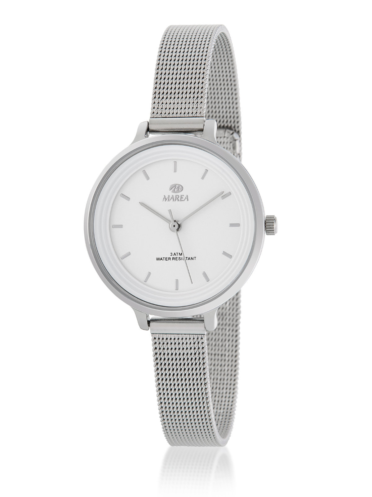 Movimiento japonés: 3 agujas Diámetro Caja: 32 mm. Material Caja: Metal Material Brazalete: Acero Esfera: Color blanco Resistente al agua: 3 ATM