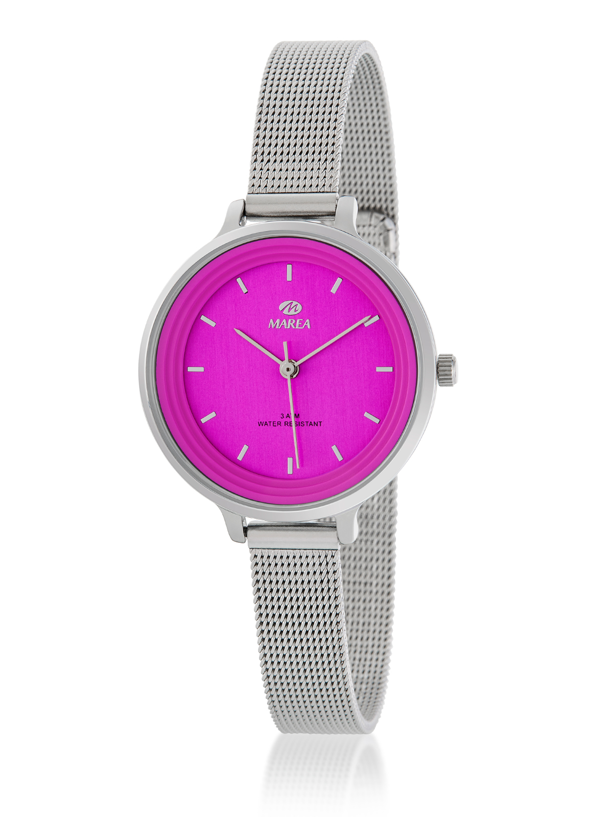 Movimiento japonés: 3 agujas Diámetro Caja: 32 mm. Material Caja: Metal Material Brazalete: Acero Esfera: Color fucsia Resistente al agua: 3 ATM