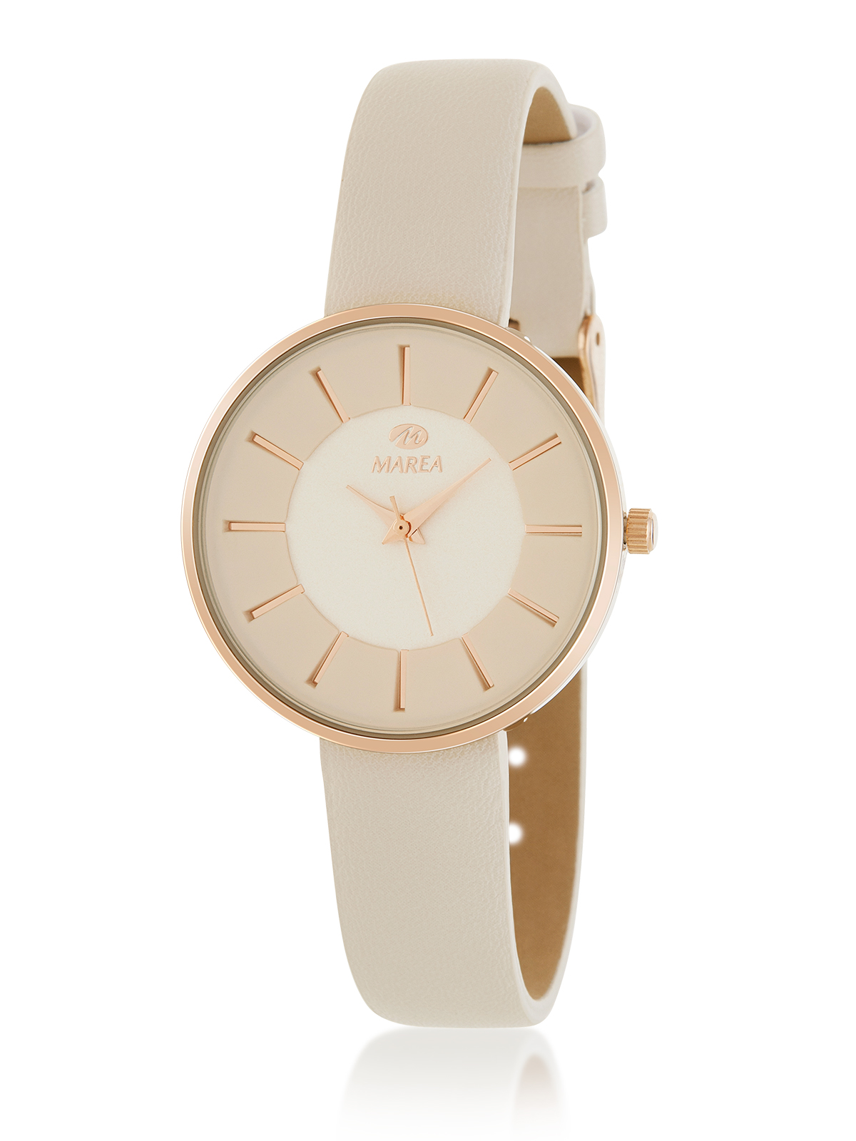 Movimiento japonés: 3 agujas Diámetro Caja: 34 mm. Material Caja: Metal Material Brazalete: Piel en color beige Esfera: Color beige Resistente al agua: 3 ATM