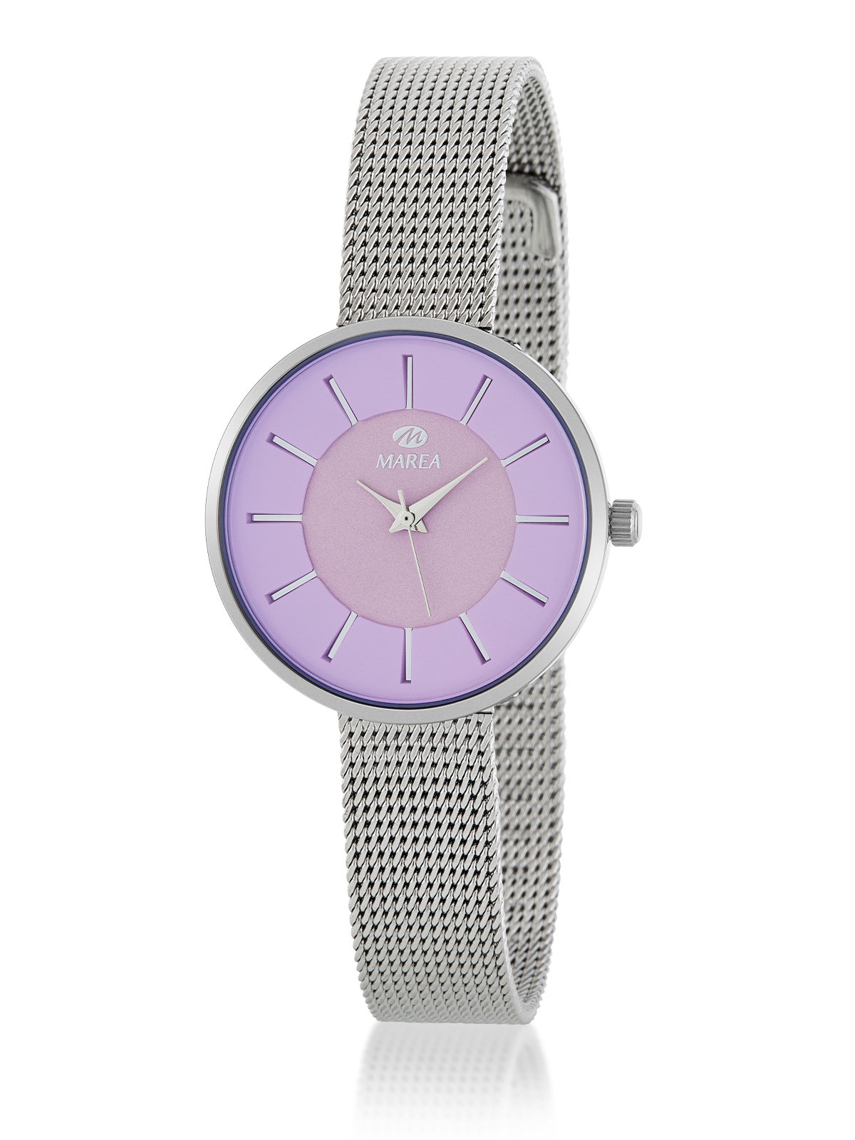 Movimiento japonés: 3 agujas Diámetro Caja: 30 mm. Material Caja: Metal Material Brazalete: Acero Esfera: Color lila Resistente al agua: 3 ATM