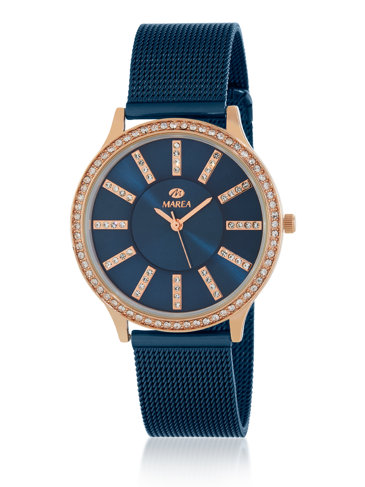 Movimiento japonés: 3 agujas Diámetro Caja: 38 mm. Material Caja: Metal Material Brazalete: Acero en color azul Esfera: Color azul con piedras y bisel en dorado Resistente al agua: 5 ATM