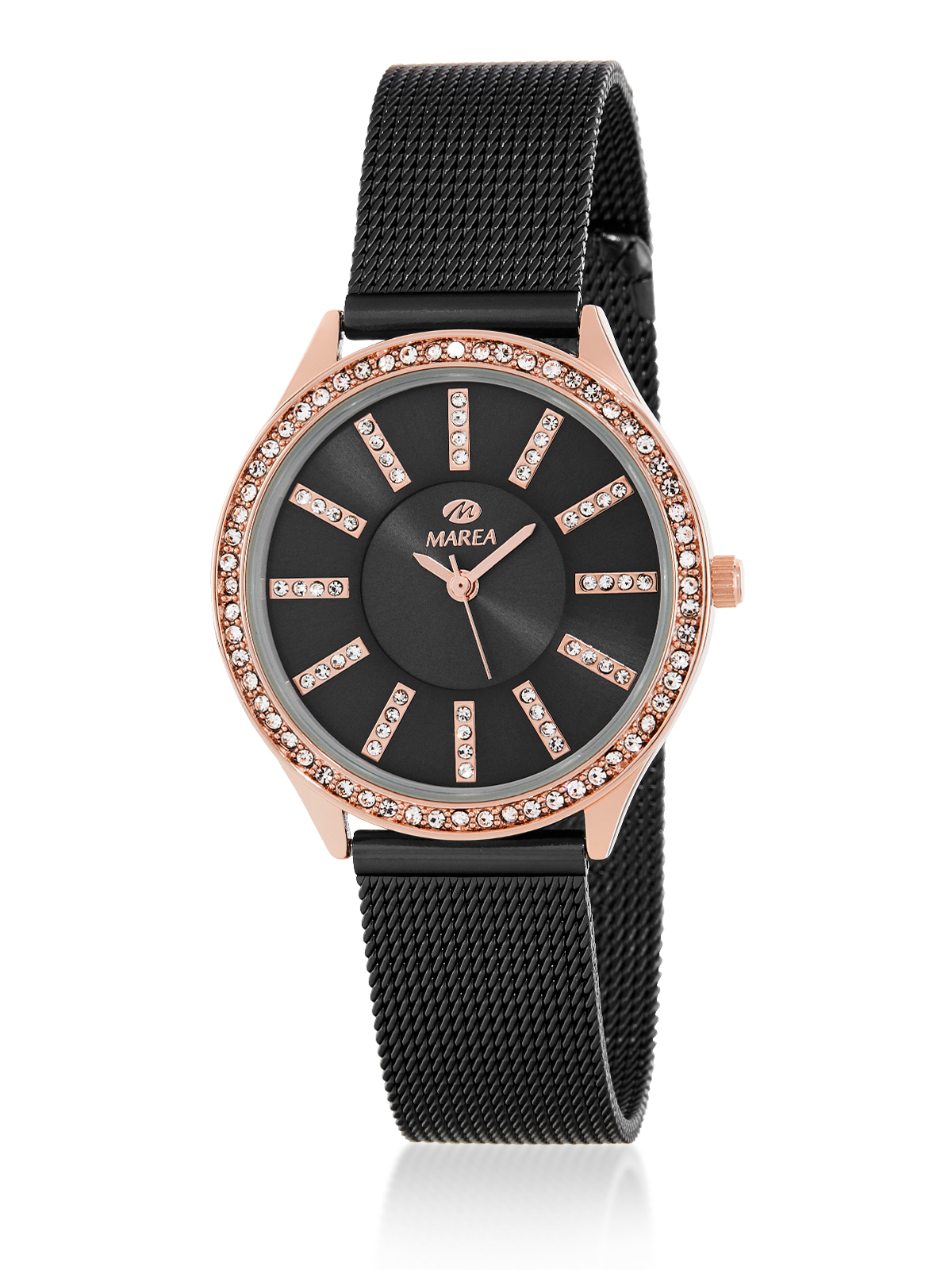 Movimiento japonés: 3 agujas Diámetro Caja: 34 mm. Material Caja: Metal Material Brazalete: Acero en color negro Esfera: Color negro con piedras, bisel en rose gold Resistente al agua: 3 ATM