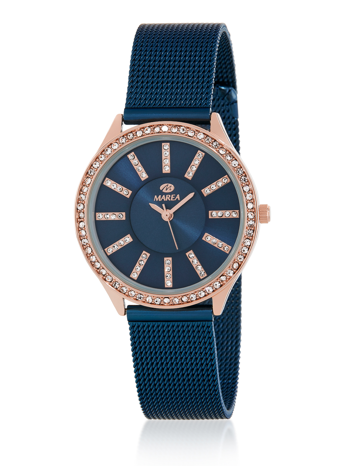 Movimiento japonés: 3 agujas Diámetro Caja: 34 mm. Material Caja: Metal Material Brazalete: Acero en color azul Esfera: Color azul con piedras, bisel en rose gold Resistente al agua: 3 ATM