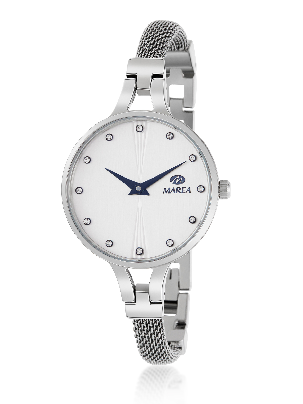 Movimiento japonés: 2 agujas Diámetro Caja: 32 mm. Material Caja: Metal Material Brazalete: Acero Esfera: Color blanco Resistente al agua: 3 ATM