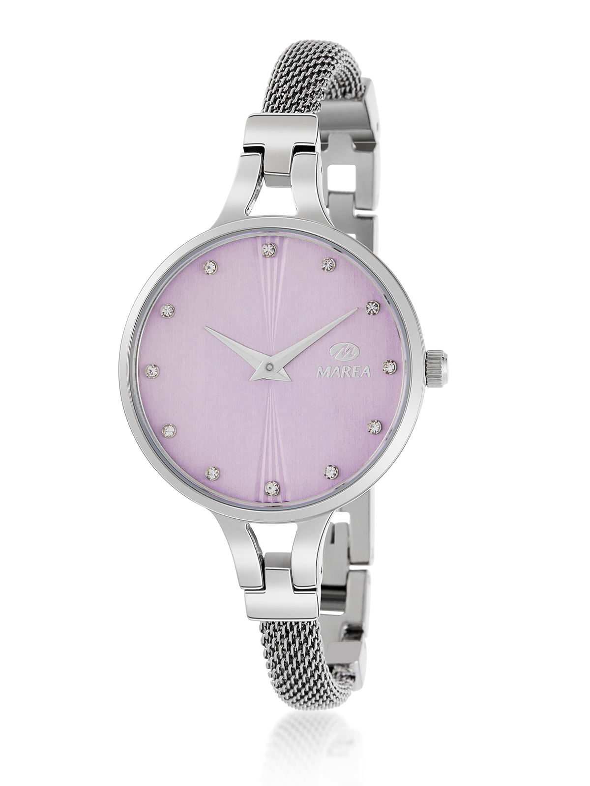 Movimiento japonés: 2 agujas Diámetro Caja: 32 mm. Material Caja: Metal Material Brazalete: Acero Esfera: Color lila claro Resistente al agua: 3 ATM