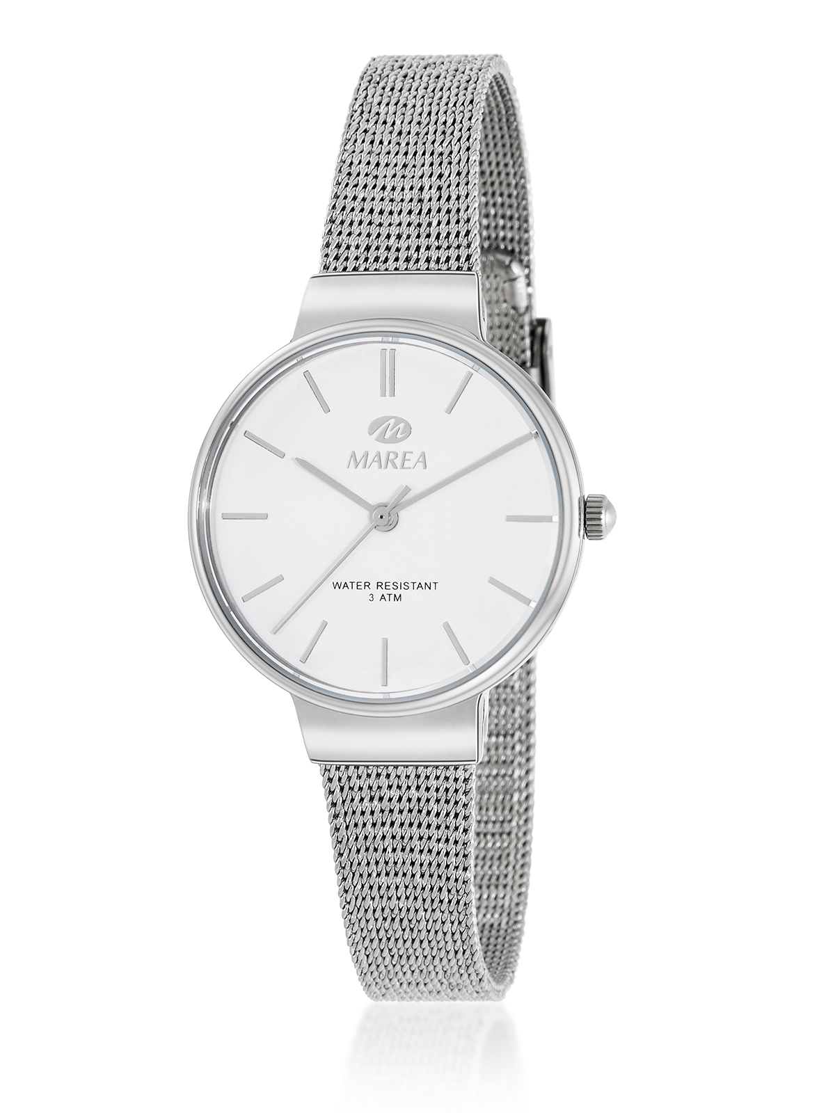 Movimiento japonés: 3 agujas Diámetro Caja: 30 mm. Material Caja: Metal Material Brazalete: Acero Esfera: Color blanco Resistente al agua: 3 ATM