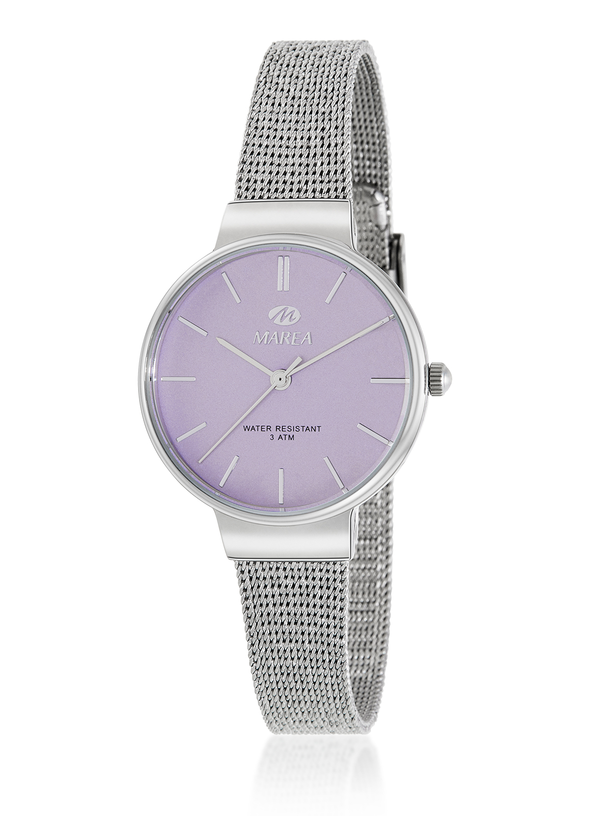 Movimiento japonés: 3 agujas Diámetro Caja: 30 mm. Material Caja: Metal Material Brazalete: Acero Esfera: Color lila claro Resistente al agua: 3 ATM