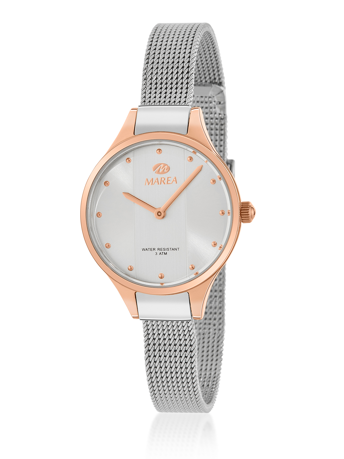 Movimiento japonés: 2 agujas Diámetro Caja: 30 mm. Material Caja: Metal Material Brazalete: Acero Esfera: Color gris con detalles en rose gold Resistente al agua: 3 ATM